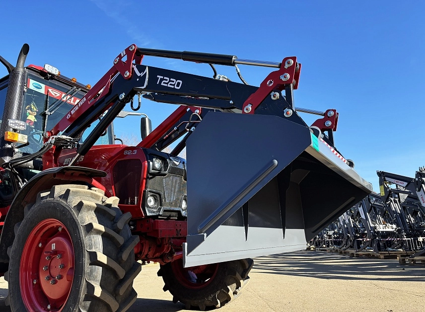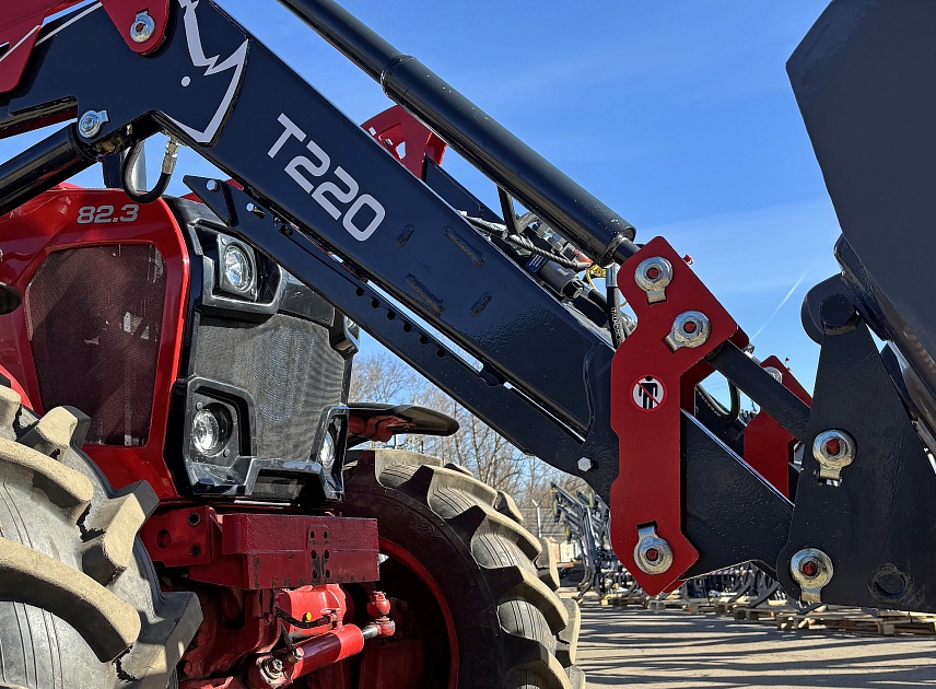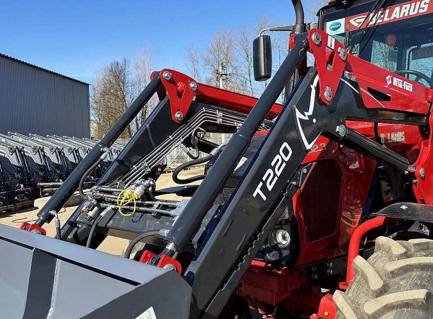 Высота до оси вращения навесного рабочего органа составляет 3570 мм. Изготовлен из конструкционной низколегированной стали 09Г2С. Благодаря уменьшению количества сварных соединений и применению новых технологий в производстве погрузчика удалось добиться снижения веса без потери грузоподъемности и прочностных характеристик. Масса стрелы Т220 составляет 440 кг. Масс Погрузчика Т220 с опорной конструкцией 625 кг.