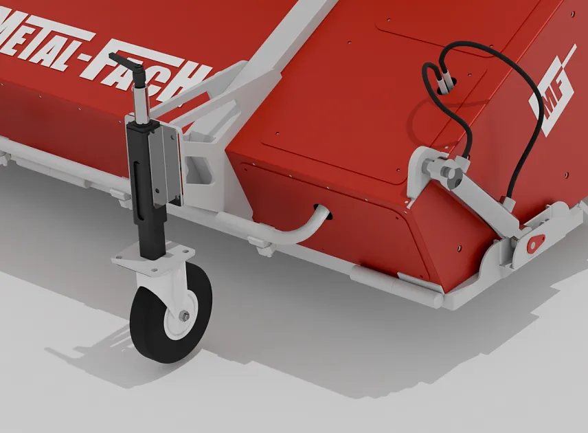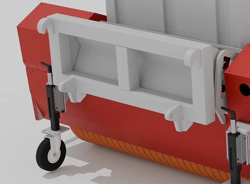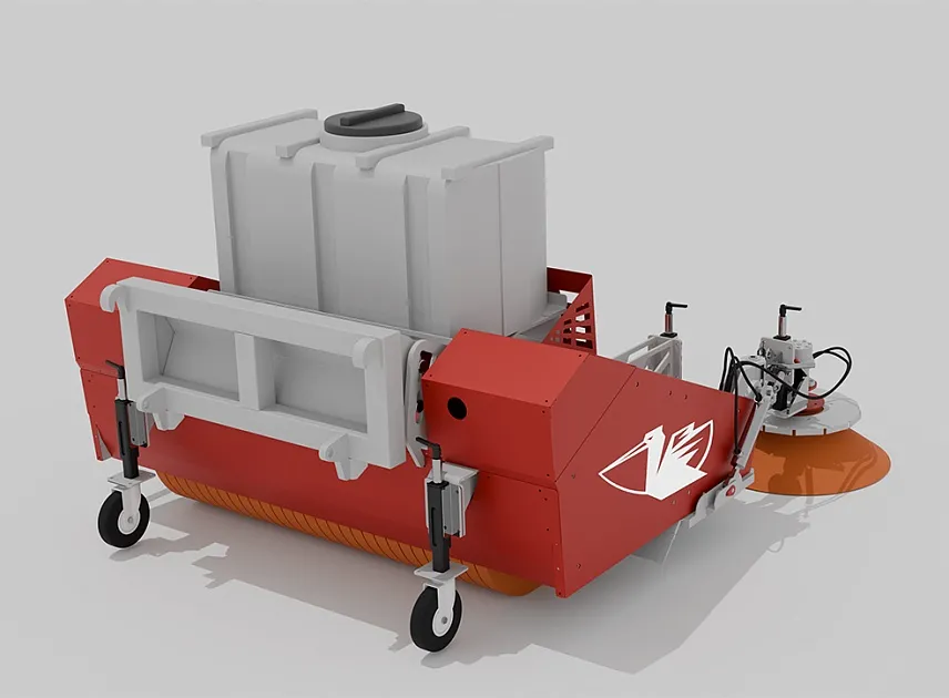 Всесезонное оборудование с индивидуальным дизайном. Рабочая ширина щетки с боковой щеткой составляет 2 метра. Без дополнительной боковой щетки - 1,41 метра. Система прохождения препятствий позволяет комфортно работать на неровных поверхностях. Щетка оснащена гидравлическим приводом от насоса трактора с подключением через быстросъёмные соединения к погрузчику или ПНУ. На максимально допустимой скорости скорость вращения подметального валика достигает 470 об/мин (скорость вращения валика зависит от оборотов двигателя, то есть работы насоса). На холостом ходу двигателя скорость вращения подметального валика - 140 об/мин. Щетка управляется при помощи специального пульта. Система управления позволяет независимо работать разными комбинациями положения рабочих щеток.