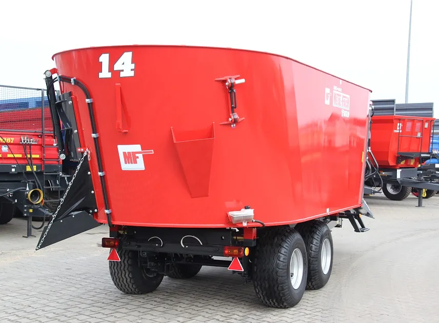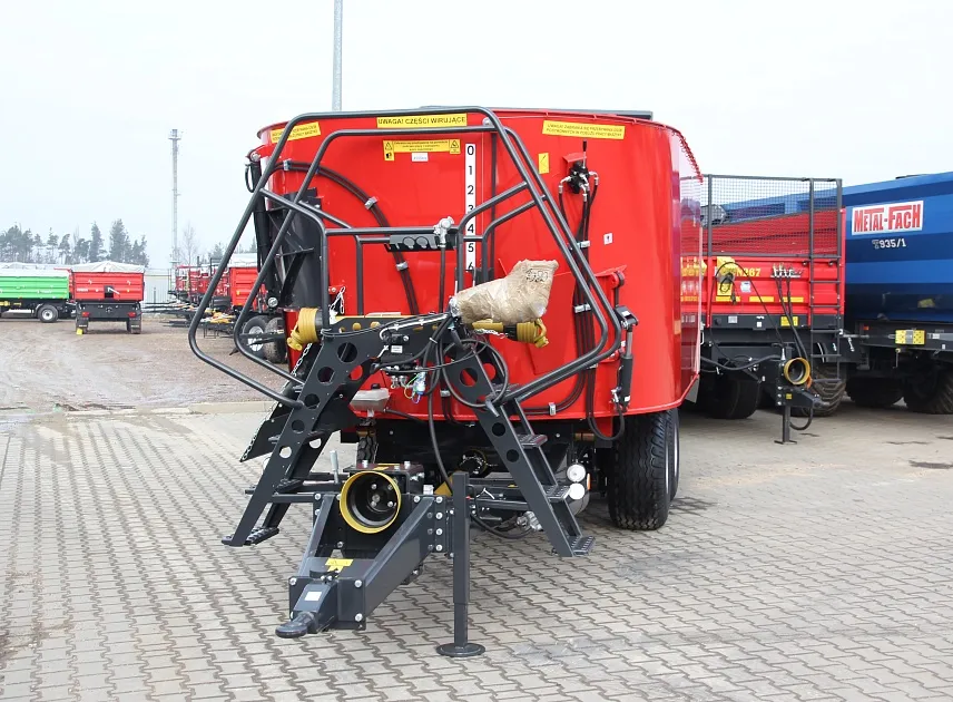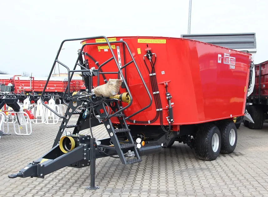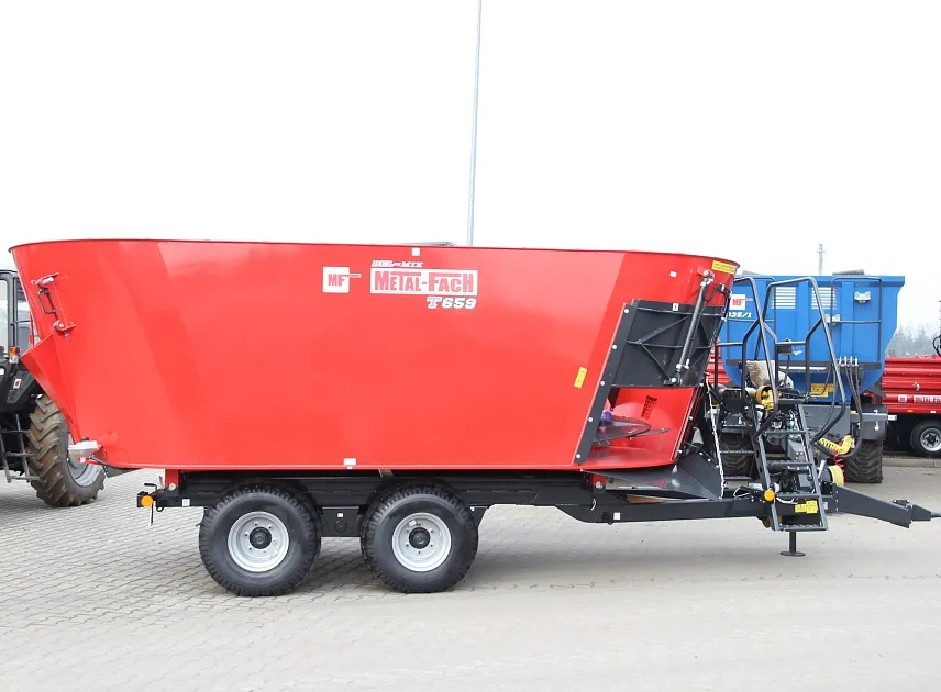 Миксер-кормораздатчик Metal-Fach T-659 объемом 14 м³ — это высокопроизводительная и технологичная машина, предназначенная для приготовления и точной раздачи однородных кормовых смесей в животноводческих комплексах. Двухшнековая смесительная система, которая обеспечивает интенсивное и бережное перемешивание даже самых разнородных компонентов — от грубых кормов и силоса до концентратов и добавок — создавая идеально сбалансированную по составу и структуре кормовую массу без сепарации ингредиентов. Ключевым преимуществом модели является интегрированная весовая система, которая позволяет с высокой точностью контролировать как загрузку отдельных компонентов в процессе приготовления, так и дозированную раздачу готовой смеси. Это обеспечивает строгое соблюдение рецепта, предотвращает перерасход дорогостоящих кормов и позволяет вести точный учет расхода. Двухскоростной редуктор предоставляет оператору гибкость в выборе режима работы: на пониженной скорости осуществляется тщательное и плавное перемешивание, а повышенная скорость позволяет быстро и эффективно выгружать готовый корм, что значительно экономит время на цикл подготовки и раздачи. Таким образом, Metal-Fach T-659 сочетает в себе мощность смешивания, точность дозирования и оперативность, являясь надежным звеном для оптимизации кормления и повышения рентабельности животноводческого хозяйства.