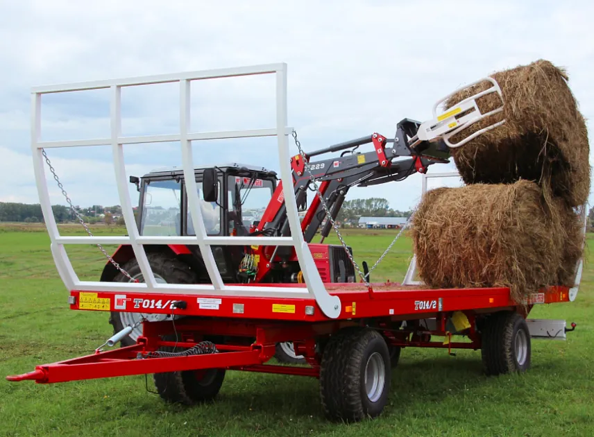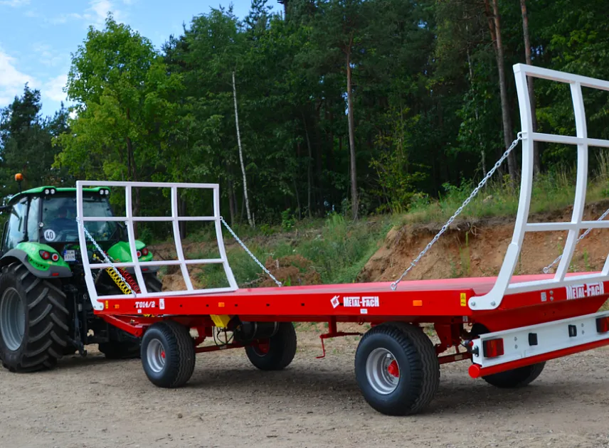 Тракторный платформенный прицеп создан с использованием качественного металла, прошедшего специальную антикоррозийную обработку. Позволяет перевозить за один раз большое количество рулонов сена или соломы. Специальная конструкция тракторного прицепа Метал Фах обеспечивает надёжную фиксацию рулонов и предотвращает их падение при транспортировке.